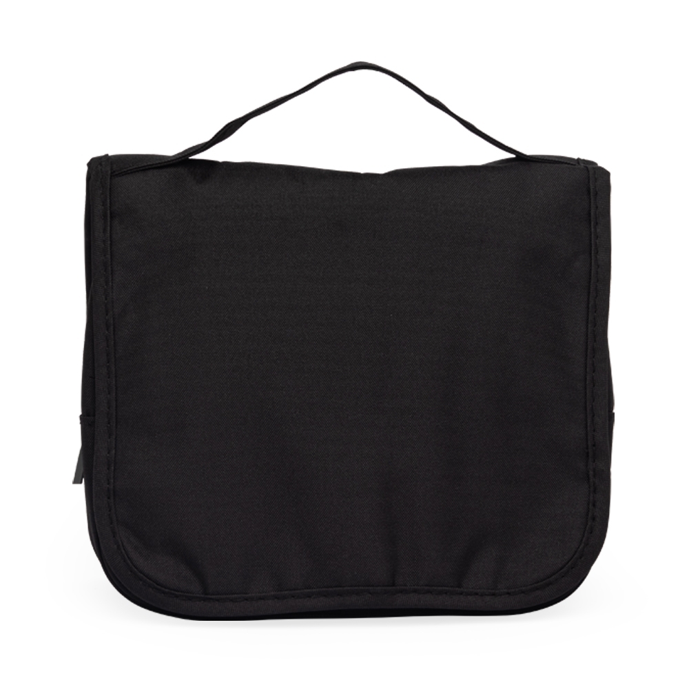 Balcões de RetiradaNécessaire confeccionado em Nylon Oxford resiste à água. Possui compartimento principal com visor em tela de nylon e outros dois em formatos distintos: um em PVC com fechamento em zíper e outro em tela respirável de nylon. Conta ainda com gancho plástico para manter a bolsa pendurada enquanto aberta.